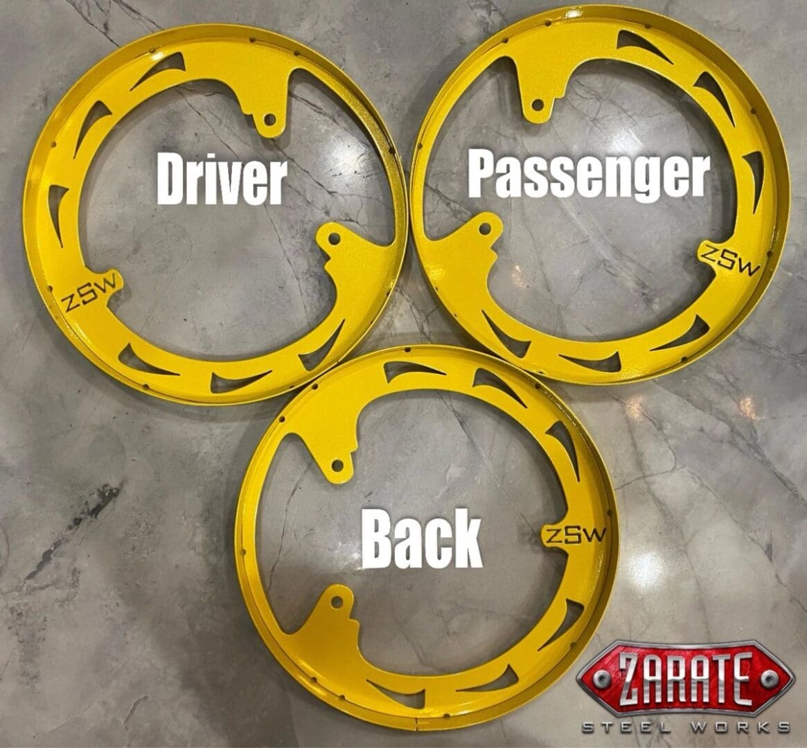 The SS ZSW Wheel Ring DIY Kit-Blade is the latest customizable designed rings available to give your slingshot more of an added design. They are made out of durable steel. Perfectly round out of the box and powder coated for durability. No need for adjusting or bending. This kit allows you to add your own LED’s. Also available in raw steel finish for your own DIY custom painting. The width measures at 2″ inches and can accommodate a 48″ inch long strip of LED lights. The Wheel Ring kit mounts up to your factory caliper bolts.